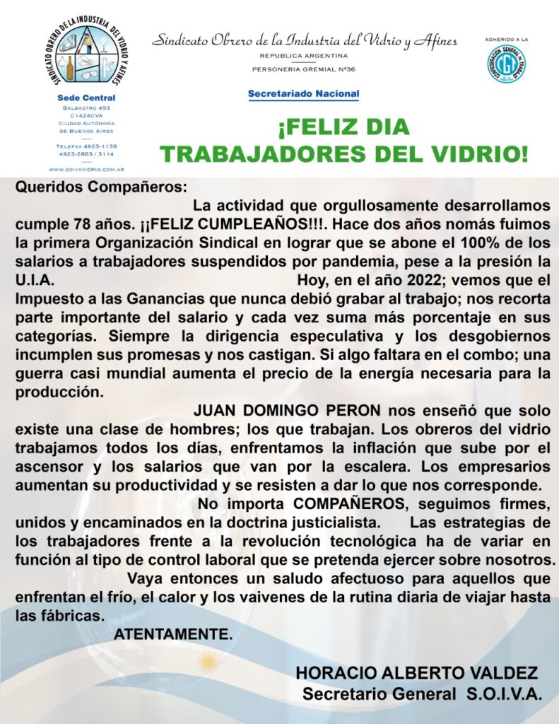 La organización sindical de los trabajadores del Vidrio cumplió 78 años de existencia. El secretario nacional del SOIVA, Horacio Valdez, aprovechó el cumpleaños para remarcar los logros pero también para sostener la crítica contra los “desgobiernos” y la UIA.