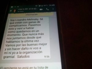 Soy Lisandro Melinsky. Sé que están con ganas de complicarnos. Pasemos esto y vení a hablar como quedamos en un momento. Que nunca más nos juntamos desde que hablamos por última vez. Vamos por las buenas mejor, y sin hacernos daño mejor ni vos a ni yo a la organización gremial. Saludos”.