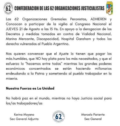 Las 62 Organizaciones Gremiales Peronistas anunciaron que el jueves 21 de agosto a las 15 horas realizarán una vigilia frente al Congreso Nacional, en rechazo a los decretos y medidas del Gobierno que —según denunciaron— buscan avanzar contra conquistas históricas del movimiento obrero.